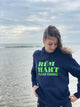 - Hoodiefarbe serene blue (hellblau)mit Aufdruck "barfuss am Strand" in neon grün
